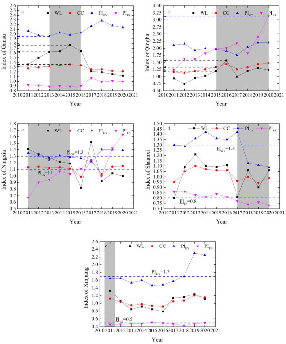 通过新模型研究首次清晰识别出西北地区资源超载的两种典型模式,即以甘肃省为代表的“产量低效型”超载与青海省为代表的“资源丰沛型产值开发不足”超载,进一步通过障碍度分析,解析出超载的四种主要具体驱动因素,即劳动力复垦率负反馈、双重水资源压力、生态用水调配用于土壤治理以及工业过度依赖,实现了从现象描述到机制解析的跨越。此外,研究分析西北五省区水土资源承载力在经济、生态、农业生产等要素协调度,发现陕西、新疆协调度高,各要素相互适配、良性运转,需维持模式并防过度开发,甘肃、青海、宁夏协调度低,各要素配置失衡、运转不畅,需优化产业结构、完善生态补偿机制推动协调发展。