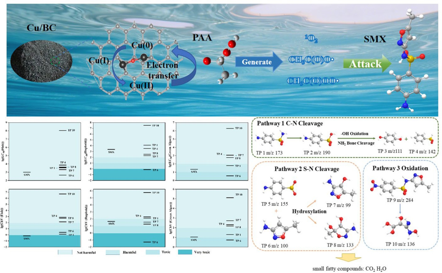 科研人员创新性地采用二次煅烧工艺制备铜改性玉米秸秆生物炭,实现载体表面二价铜离子向高活性一价铜离子的转化,一价铜离子与生物炭表面碳氧基团协同作用,显著加速电子转移,高效激活体系中的过氧乙酸,产生自由基和单线态氧,能切断磺酰胺键、打开异噁唑环实现高效解毒。密度泛函理论计算证实,该催化剂吸附能提升至-3.68 eV,对5种磺胺类抗生素去除率均超80%,且经4次重复使用后仍保持较高去除率,展现出优异的广谱降解能力和循环使用性。此外,该体系在多种水质条件下均能保持高效降解性能,降解产物无二次污染风险,且催化剂以农业废弃物玉米秸秆为原料、可循环再生,兼具环境适应性、生态安全性与可持续性。研究为水体抗生素污染治理提供了高效稳定、环境友好、经济可行的解决方案。